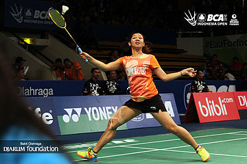 Febby Angguni (Indonesia) menyambut pengembalian dari Tao Xue (China).