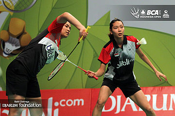 Gloria Emanuelle/Melati Daeva (Indonesia) bersiap menghadang serangan yang dilepaskan Annisa Saufika/Rika Rositawati (Indonesia).