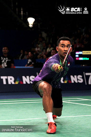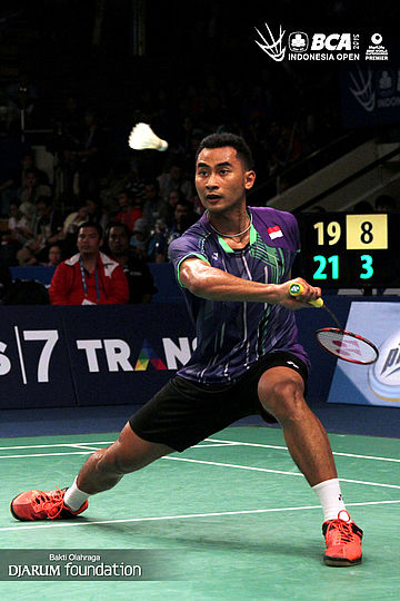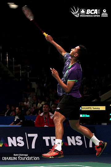 Tommy Sugiarto (Indonesia) mengembalikan shuttlecock ke arah Lin Dan (China).