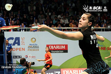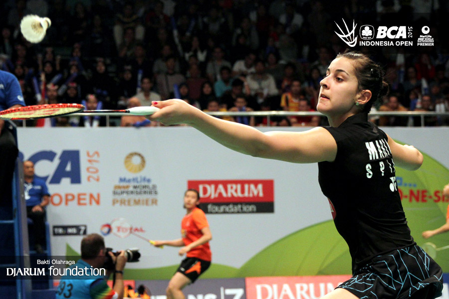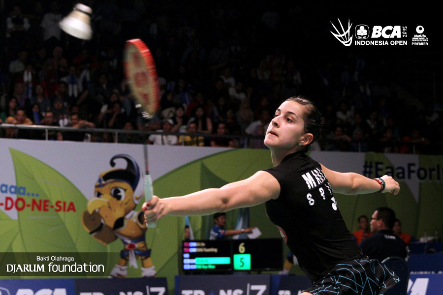 Ekspresi Carolina Marin (Spanyol) saat mencetak poin.