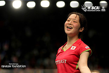 Minatsu Mitani (Jepang) harus terjatuh saat meladeni perlwanan dari Adrianti Firdasari (Indonesia).