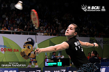 Carolina Marin (Spanyol) mengembalikan shuttlecock ke arah Yui Hashimoto (Jepang).