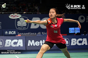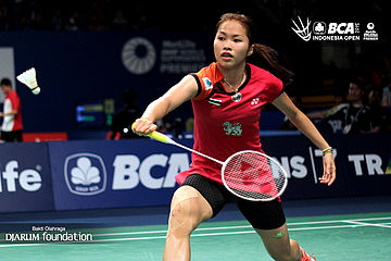 Ratchanok Intanon (Thailand) mengembalikan shuttlecock ke arah Pai Yu Po (China Taipei).