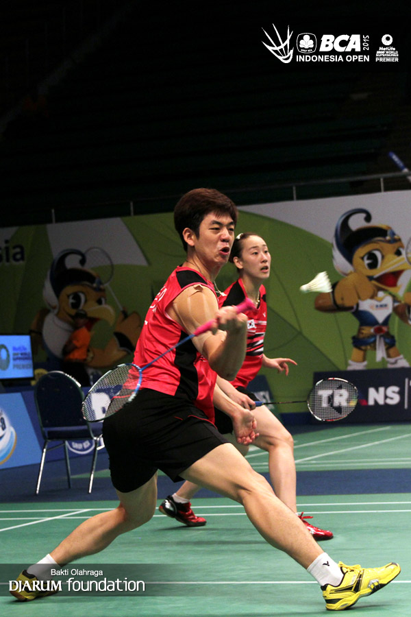 Lee Yong Dae/Lee So Hee (Korea) bersiap menghadang serangan dari Mads Pieler/Kamilla Rytter Juhl (Denmark).