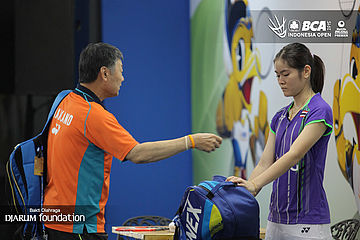 Busanan Ongbunmrungpan (Thailand) diberikan arahan oleh pelatih setelah bertanding.