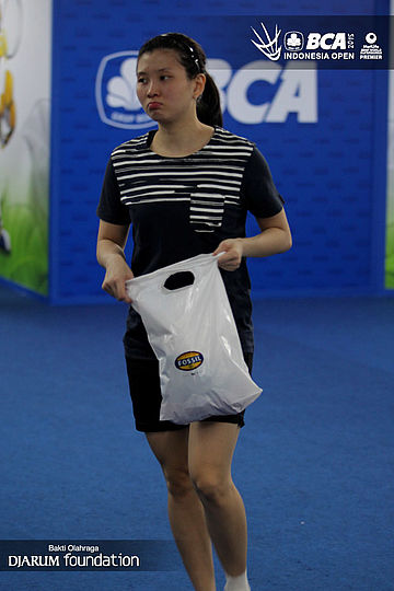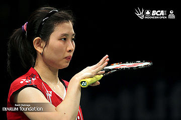 Debby Susanto (Indonesia) meminta pergantian shuttlecock.