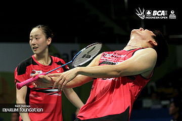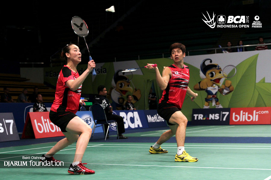 Lee Yong Dae/Lee So Hee (Korea) bersiap menyambut pengembalian dari dari Mads Pieler/Kamilla Rytter Juhl (Denmark).