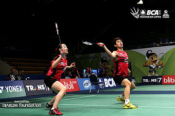 Praven Jordan/Debby Susanto (Indonesia) menghadang serangan dari Mark Lamsfuss/Isabel Herttrich (Jerman).