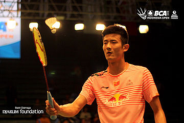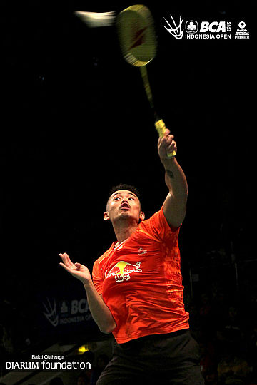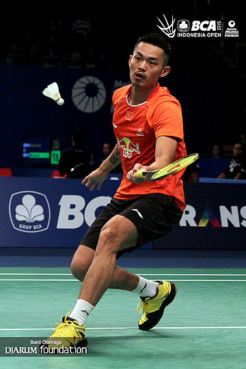 Lin Dan (China) mengembalikan shuttlecock ke arah Tommy Sugiarto (Indonesia).