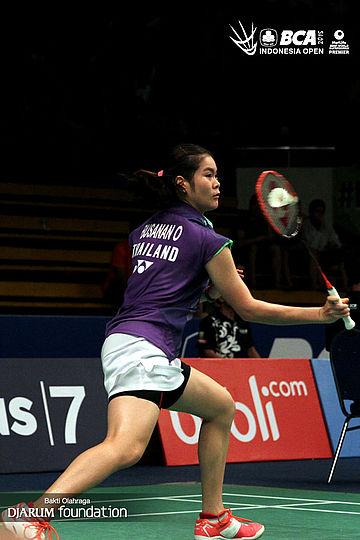 Busanan Ongbumrungpan (Thailand) mengembalikan shuttlecock ke arah Ratchanok Intanon (Thailand).
