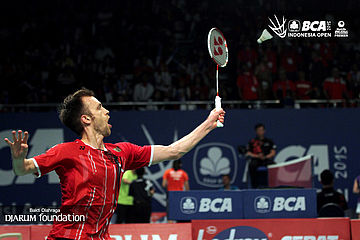 Marc Zwiebler (Jerman) mengembalikan shuttlecock ke arah Tommy Sugiarto (Indonesia).