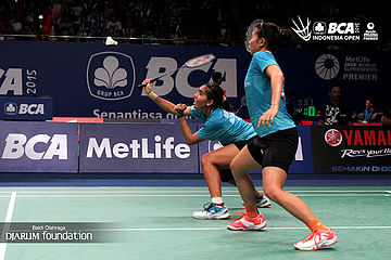 Puttita Supajirakul/Sapsiree Taerattanachai (Thailand) saling berkomunikasi dilapangan pertandingan.
