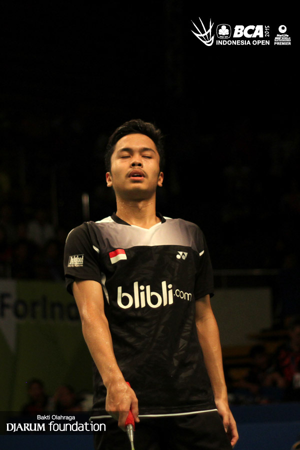 Ekspresi Anthony Sinisuka Ginting (Indonesia) saat kehilangan poin.