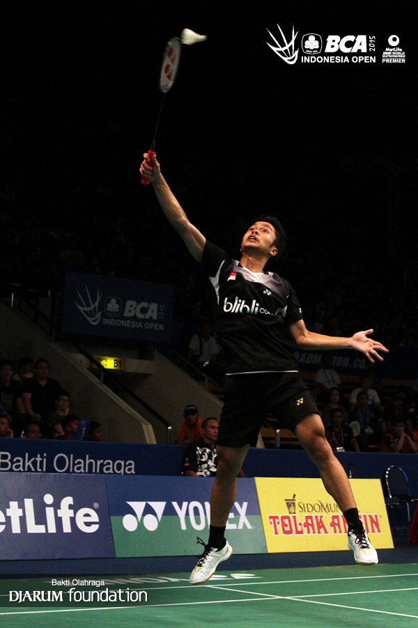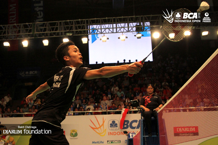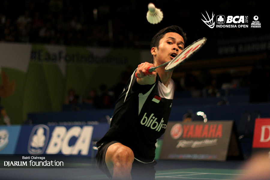Anthony Sinisuka Ginting (Indonesia) bersiap melepaskan smash.
