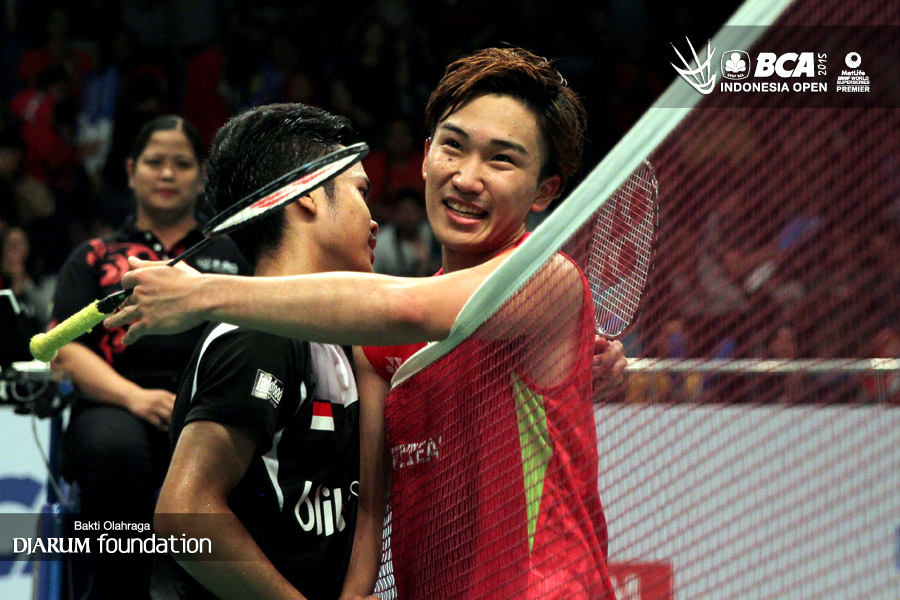 Anthony Sinisuka Ginting (Indonesia) dan Kento Momota (Jepang) saling berpelukan usai bertanding.