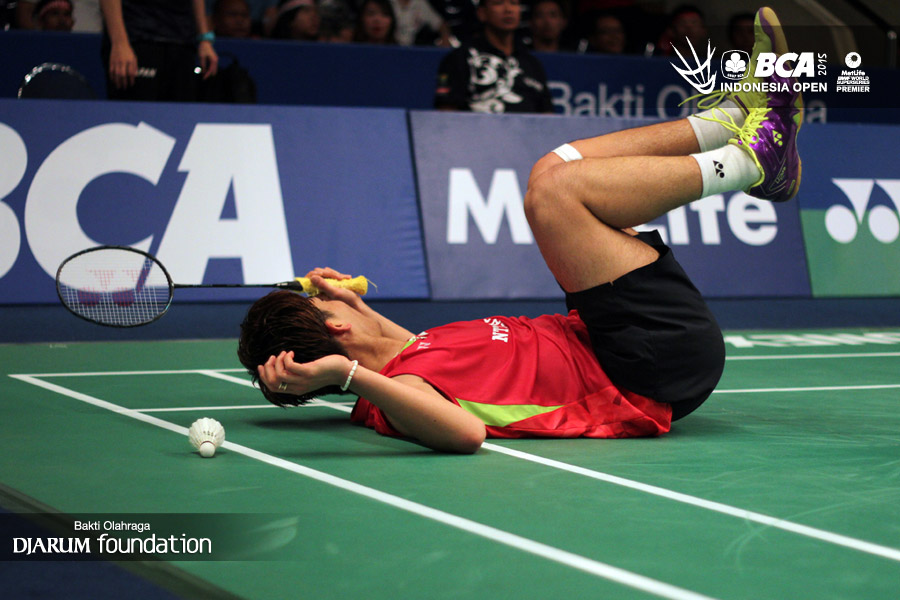 Kento Momota (Jepang) terjatuh saat menghadang serangan dari Anthony Sinisuka Ginting (Indonesia).