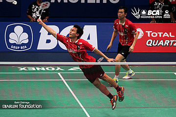 Kekompakan Hendra Setiawan/Mohamad Ahsan (Indonesia) di lapangan.