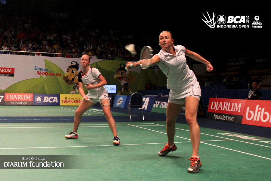 Eefje Muskens/Selena Piek (Belanda) menghadang serangan yang dilepaskan Tang Jinhua/Tian Qing (China).