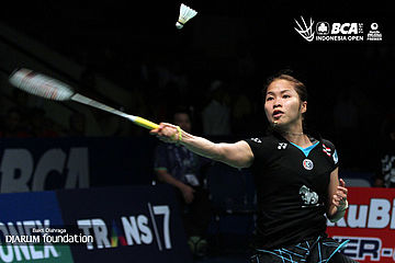Ratchanok Intanon (Thailand) menyambut pengembalian dari Wang Shixian (China).