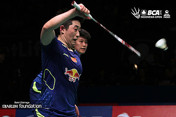 Hendra Setiawan/Mohamad Ahsan (Indonesia) melepaskan serangan ke arah Fu Haifeng/Zhang Nan (China).