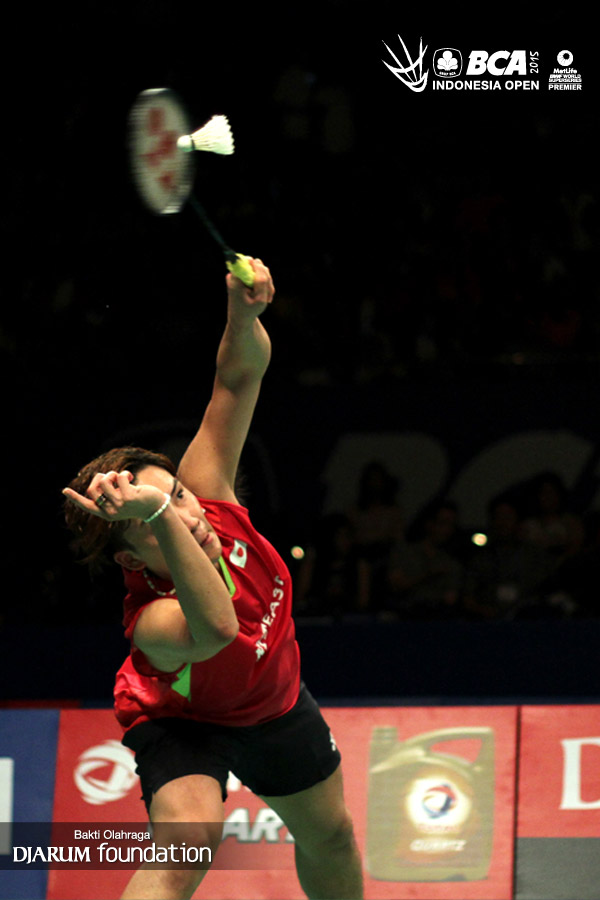 Kento Momota (Jepang) melepaskan serangan ke arah Parupali Kashyap (India).