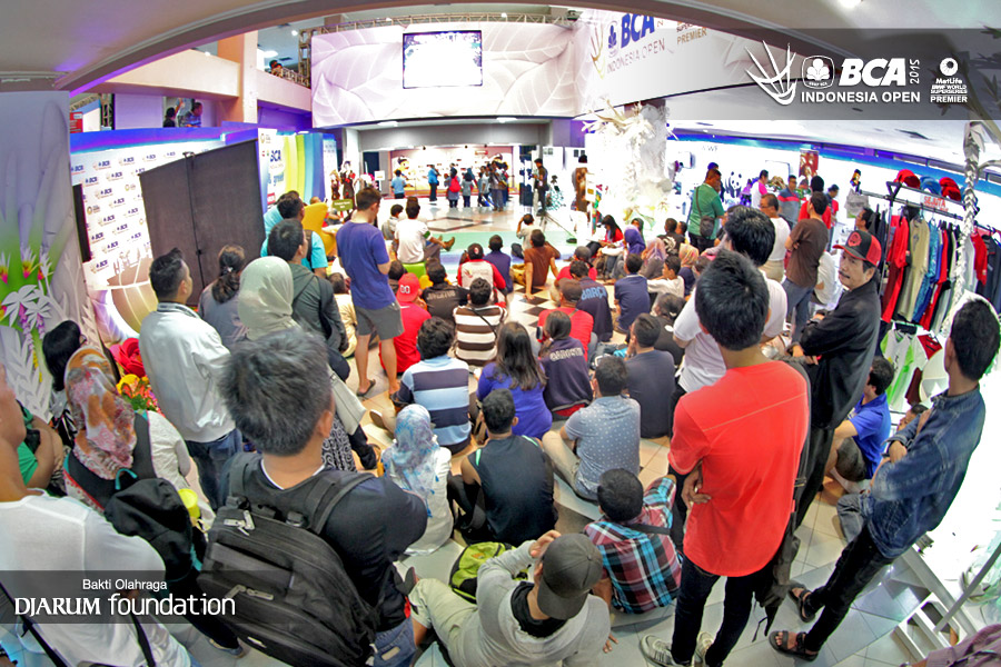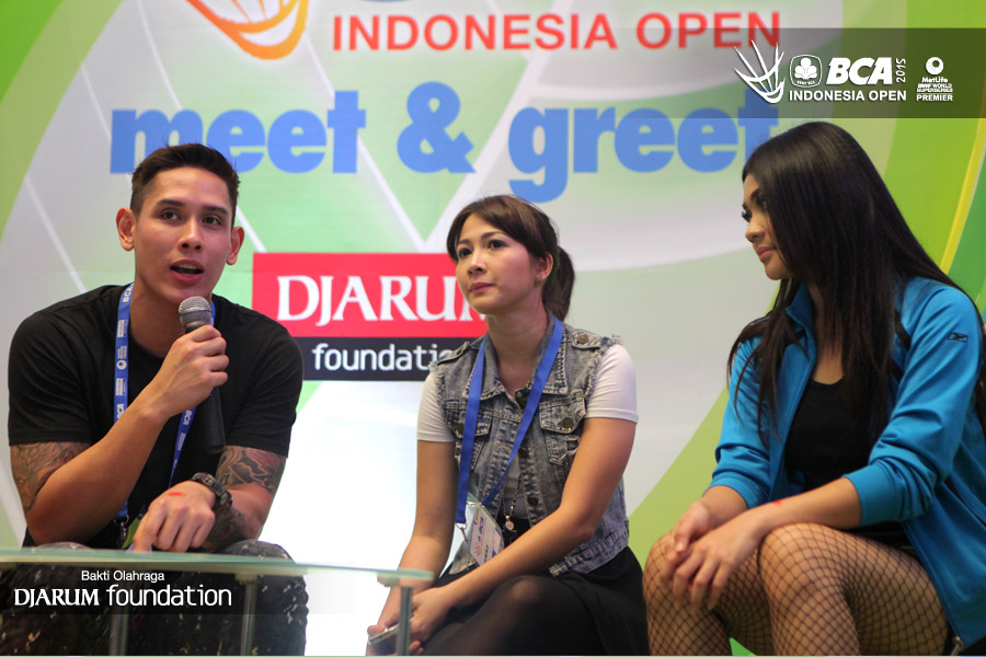 (Dari kiri) Ganindra Bimo, Andrea Dian, Indah Dewi Pertiwi saat meet and greet dengan pengunjung BCA Indonesia Open Super Series Premier 2015.