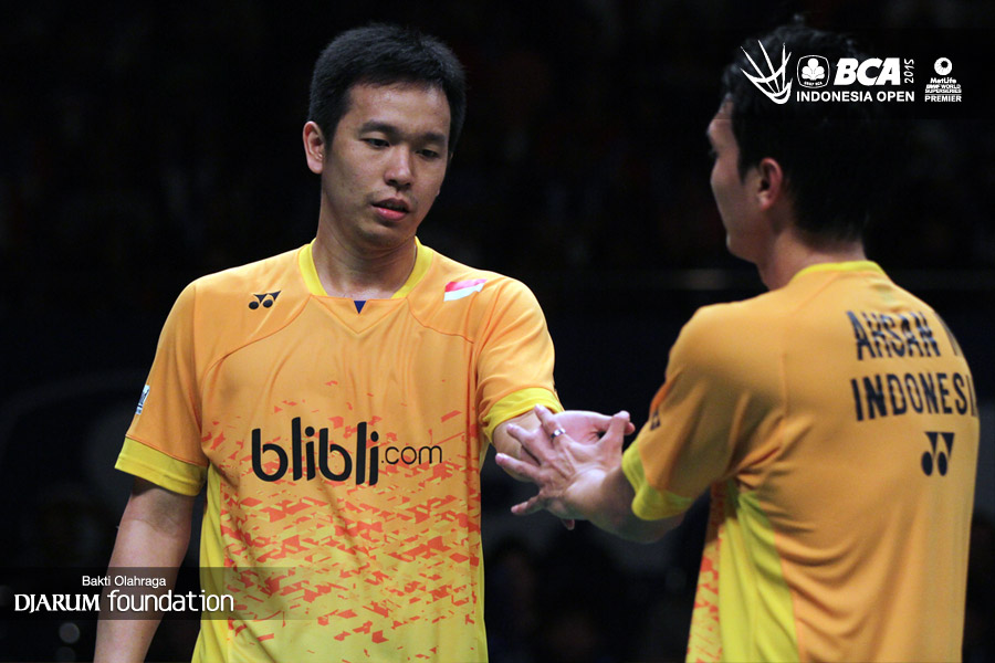 Mohammad Ahsan dan Hendra Setiawan (Indonesia) bersiap memasuki arena pertandingan.
