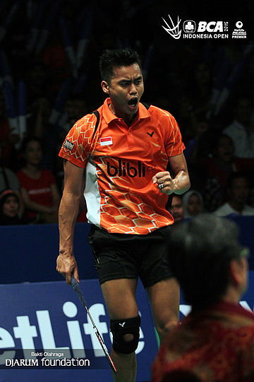 Ekspresi Tontowi Ahmad (Indonesia) saat mencetak poin.