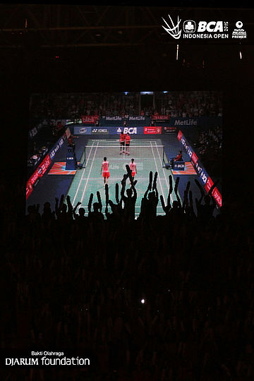 Semarak pengunjung BCA Indonesia Open Super Series Premier 2015 saat menyaksikan pertandingan Tontowi Ahmad/Liliyana Natsir melawan Zhang Nan/Zhao Yunlei (China).
