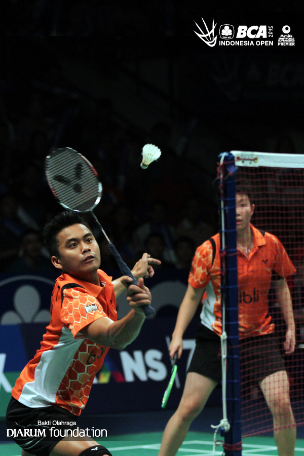 Tontowi Ahmad (Indonesia) melepaskan smash.