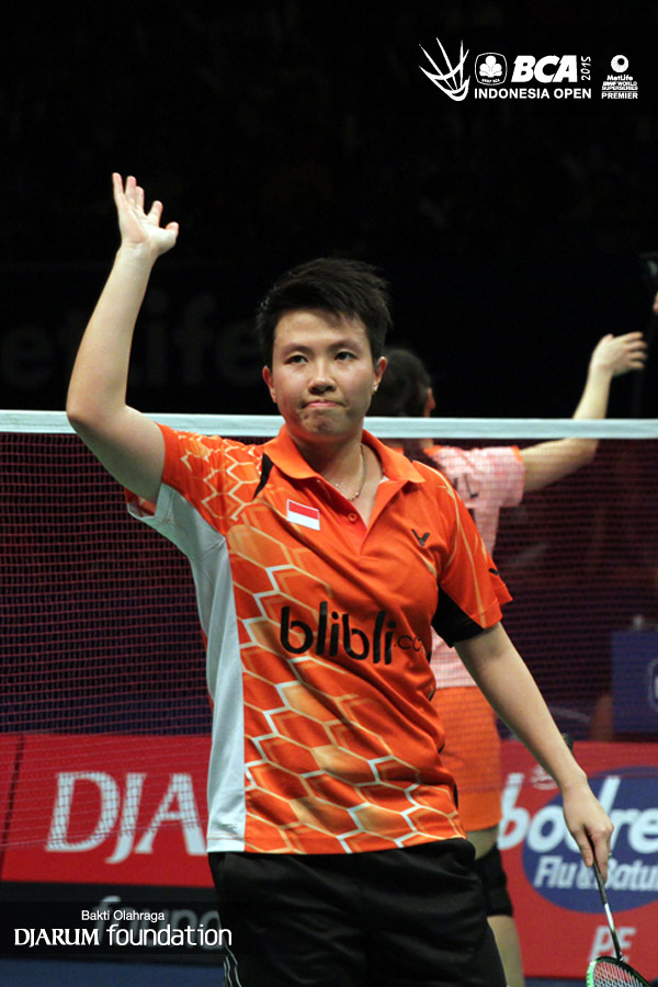 Liliyana Natsir (Indonesia) melambaikan tangan kepada pengunjung BCA Indonesia Open Super Series Premier 2015 yang telah mendukungnya.