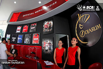 Dua usher berpose di booth merchandise PB Djarum.
