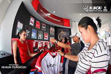 Beberapa pengunjung sedang memilih merchandise di booth PB Djarum.