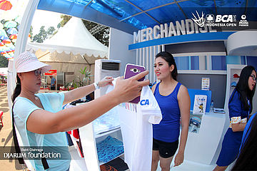 Salah seorang pengunjung sedang memilih merchandise di booth BCA.