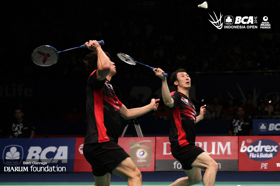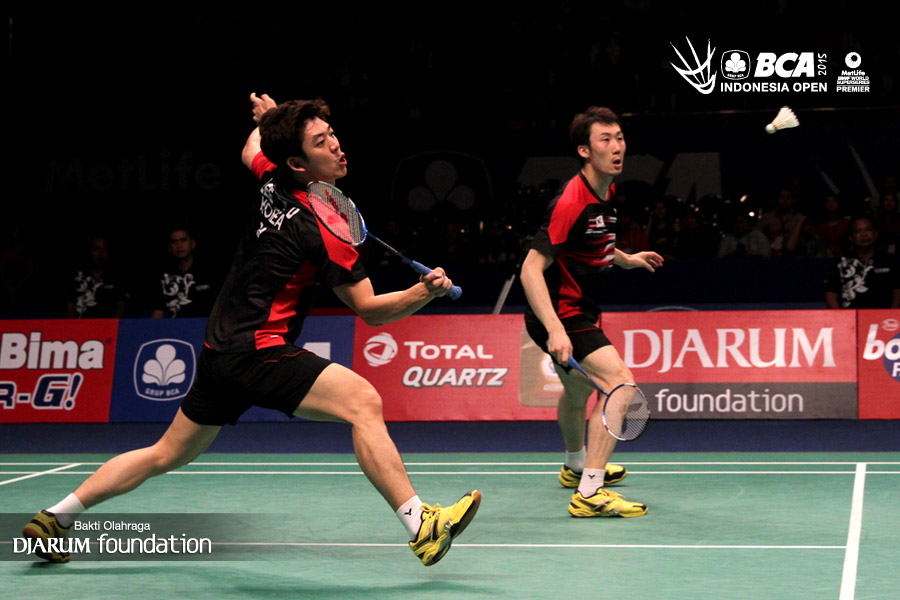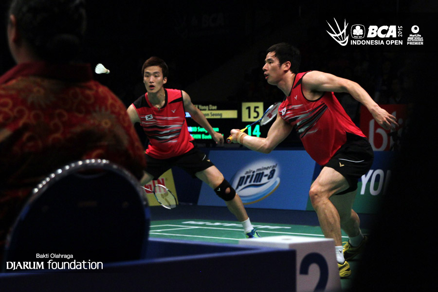Ko Sung Hyun/Shin Baek Choel (Korea) bersiap menghadang serangan yang dilepaskan Lee Yong Dae/Yo Yoen Seong (Korea).