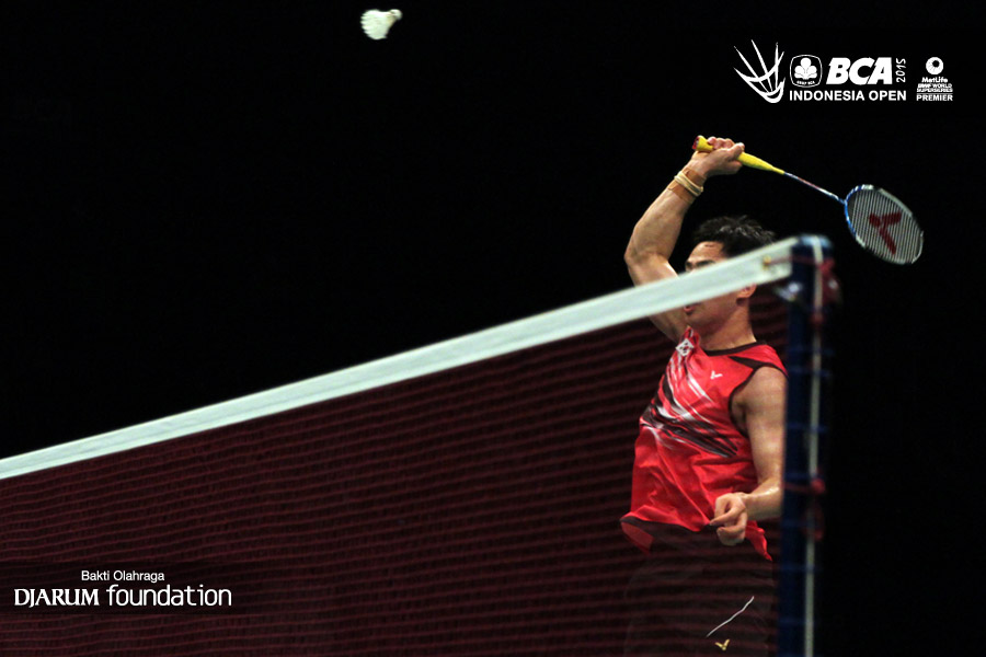 Ko Sung Hyun (Korea) bersiap menyambar pengembalian tanggung dari Lee Yong Dae/Yo Yoen Seong (Korea).