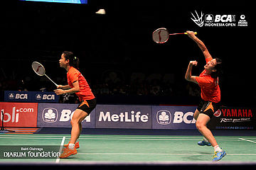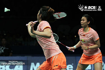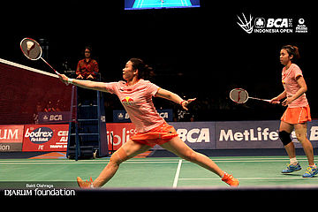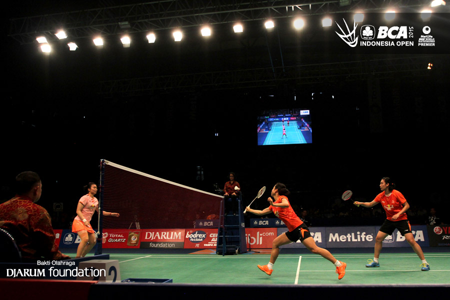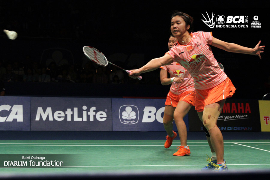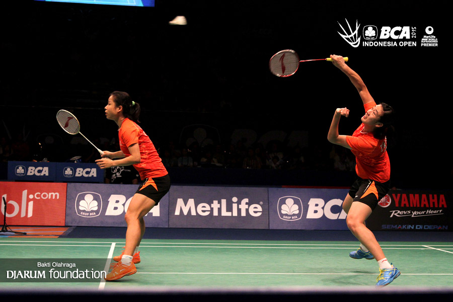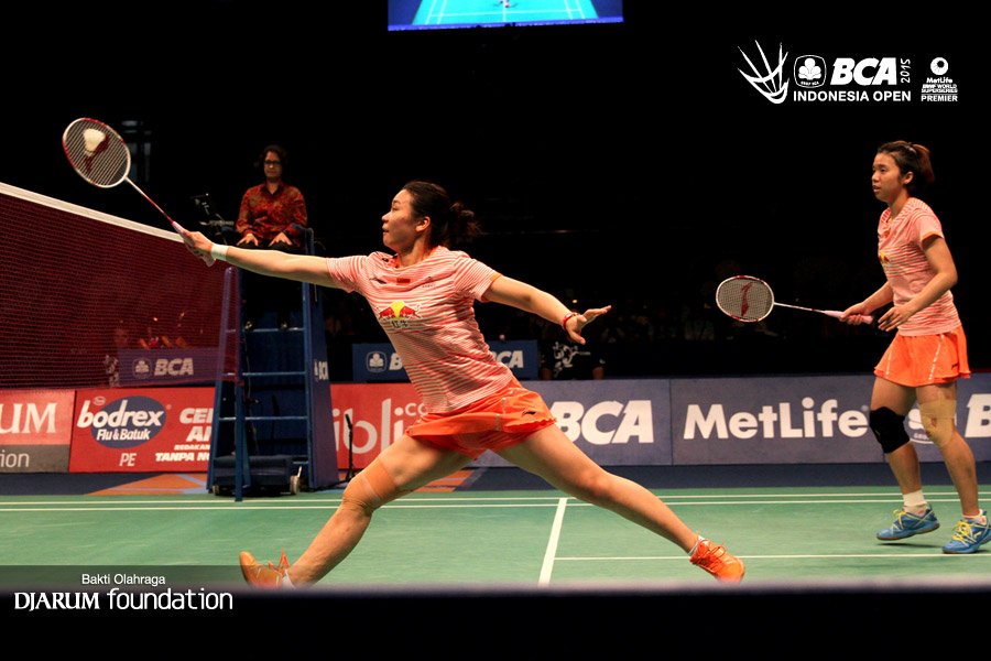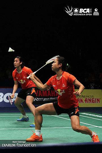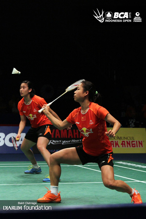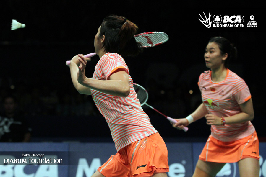 Tang Jinhua/Tian Qing (China) mengembalikan shuttlecock ke arah Ma Jin/Tang Yuanting (China).