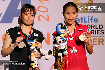 Yui Hashimoto (Jepang) dan Ratchanok Intanon (Thailand) saat di podium juara