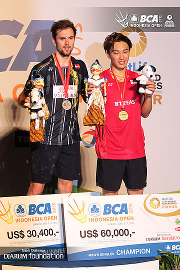Jan O Jorgensen (Denmark) dan Kento Momota (Jepang) saat di podium juara