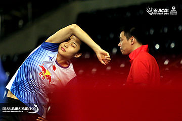 Wang Yihan (Tiongkok) saat melakukan peregangan sebelum berlatih