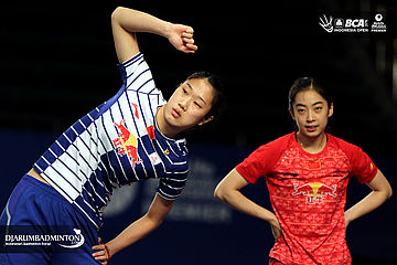 Sun Yun dan Wang Shixian (Tiongkok) melakukan peregangan sebelum berlatih