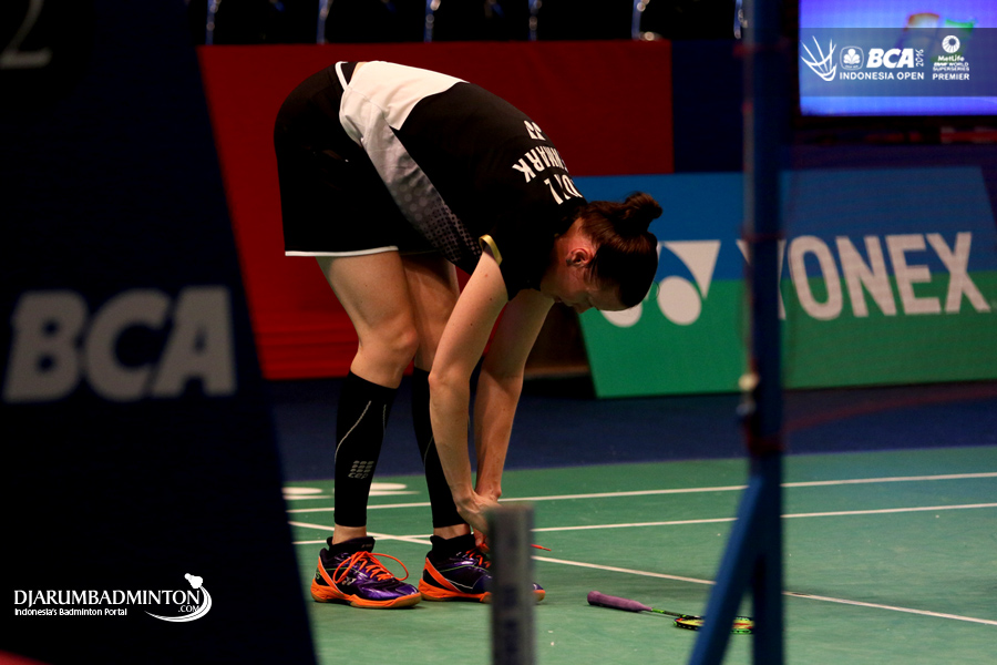 Ekspresi Kamilla Rytter Juhl (Denmark) mengikat tali sepatunya