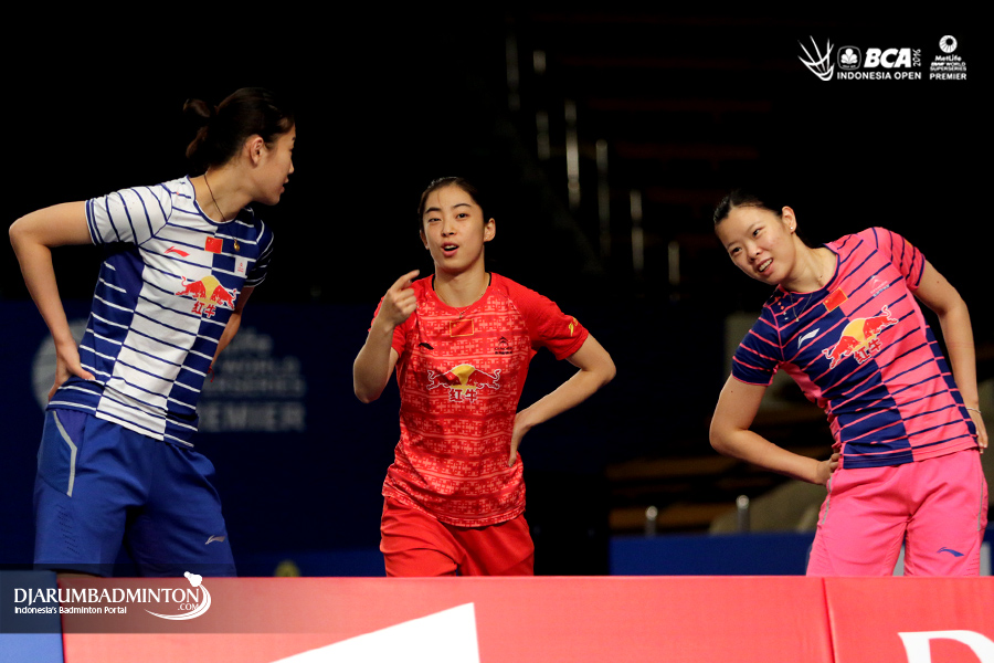 Sun Yun, Wang Shixian dan Li Xuerui (Tiongkok) berbincang sambil melakukan peregangan sebelum berlatih