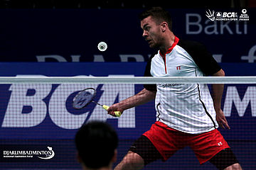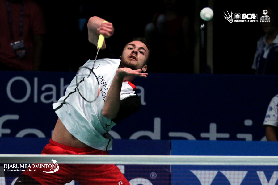 Rasmus Fladberg (Denmark) bersiap menghadang serangan