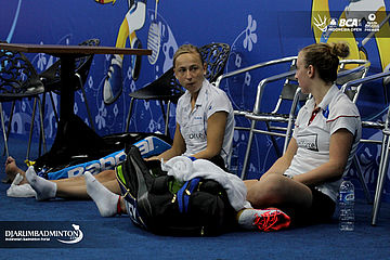 Eefje Muskens dan Selena Piek (Netherland) beristirahat seusai bertanding