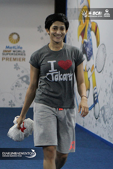 Nozomi Okuhara (Japan) berada di player lounge seusai bertanding