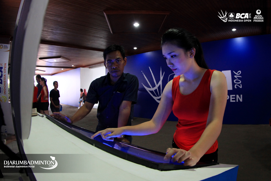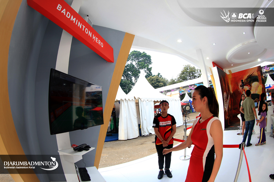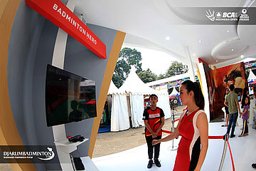 Seorang usher sedang bermain game di booth Djarum Foundation