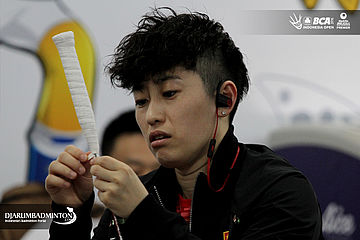 Yu Yang (Tiongkok) sedang membenarkan grip raketnya