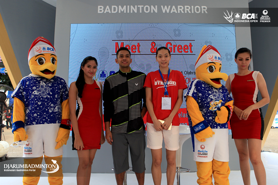 Edi Subaktiar dan Gloria Emanuelle W (Indonesia) berpose bersama maskot BIO seusai meet and greet