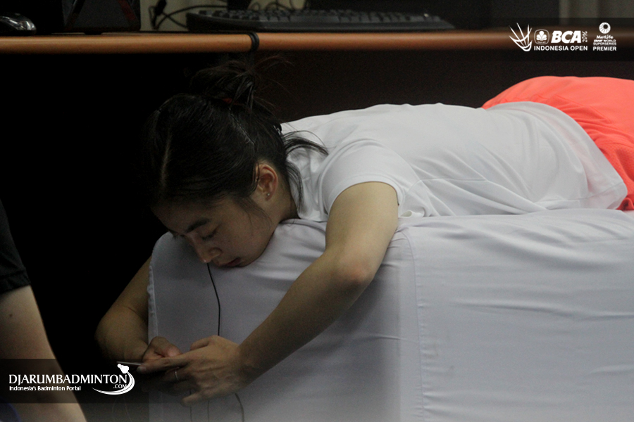 Wang Shixian (Tiongkok) terlihat bersantai di player lounge setelah bertanding